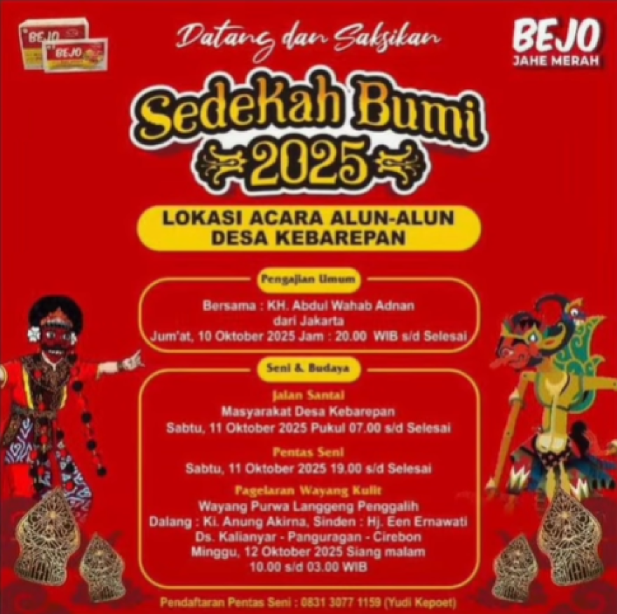 Pada tahun ini sederetan acara Sedekah Bumi yang dimulai pada hari Kamis, 9 Oktober 2025 dimulai pada pukul 19.00 WIB dengan menggelar do'a dipimpin oleh Kaur Pelayanan (Lebe) bersama di Balai Desa serta disusul dengan Pengajian Umum sekalgus memperingati Maulid Nabi Muhammad saw pada hari Jum'at 10 Oktober 2025 dimulai pukul 20.00 WIB. Pada Hari Sabtu, 11 Oktober 2025 rentetan acara "Sedekah Bumi" dengan Jalan Santai yang diikuti oleh masyarakat Desa Kebarepan, dilanjutkan pada malam harinya Pentas Seni https://www.youtube.com/live/KAgP1HC55Z0https://www.youtube.com/live/KAgP1HC55Z0 (live streaming).